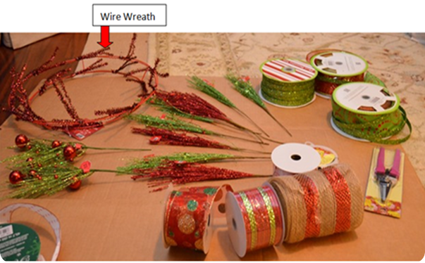 My friend Karen and I went shopping yesterday. One of our stops was Hobby Lobby where I got this wire wreath form for $3. I had some leftover wire ribbon from my Christmas trees and some mesh ribbon I had that I don’t remember what it was for. I figured I could put my ribbon to use with this form (odd looking sort of a gadget). You use the wire tinsel to hold the ribbon with.